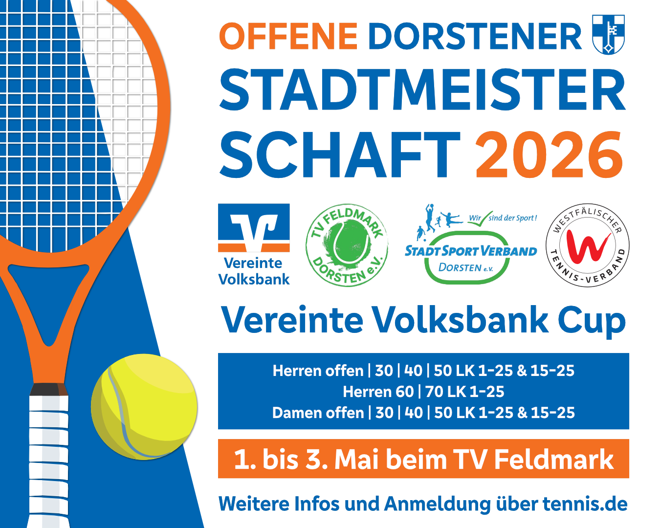Die Stadtmeisterschaften im Einzel in den offenen und Seniorenspielklassen sollen mit Unterstützung der Vereinten Volksbank – anders als zuletzt üblich – nicht am Ende der Freiluftsaison stattfinden, sondern bereits zu Saisonbeginn am verlängerten Feiertagswochenende vom 1. bis 3. Mai. So bietet das Turnier, das der TV Feldmark ausrichten wird, dieses Mal auch eine hervorragende Gelegenheit, um wertvolle Matchpraxis für die Mannschaftsspiele zu sammeln.