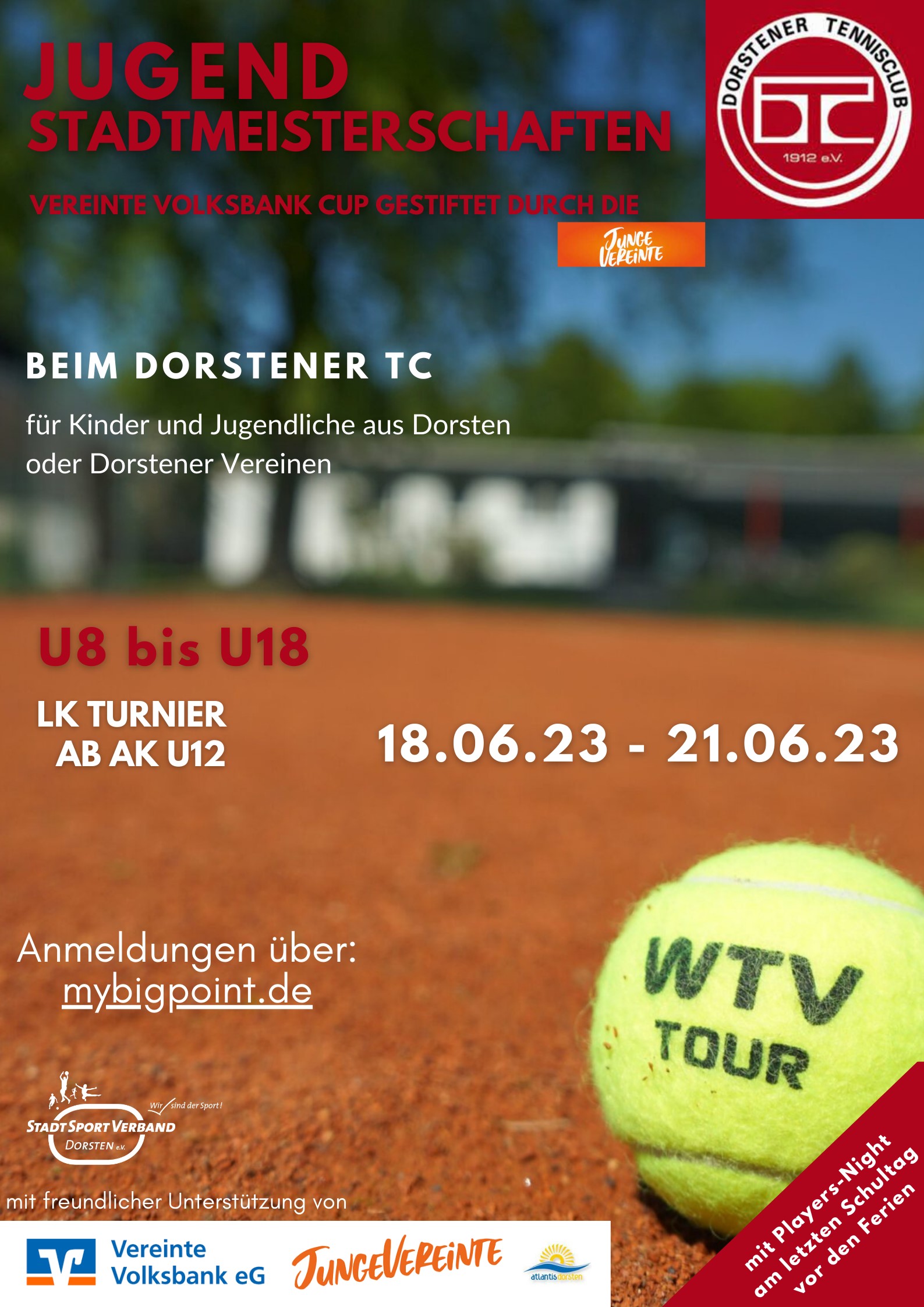 Vom 18. bis zum 21. Juni 2023 finden die Tennisstadtmeisterschaften des Stadtsportverbandes Dorsten als WTV LK Turnier statt.
